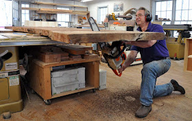 I started my woodworking career in 1974 as a logger for a local timber contractor ... I lasted about 6 months ... After that, I spent the next 23 years cutting and splitting firewood to heat my house and shop in Arlington .... I got back into the wood heat thing last year and Ive become pretty good friends with my chain saw again. When we had to cut this slab to size, I thought that my Stihl might be the best tool for the job as the log had already been chain sawn to rough shape before it was milled into slabs .. Ta Dah ... The edges actually will look like before we cut it .... Dont try this at home ....